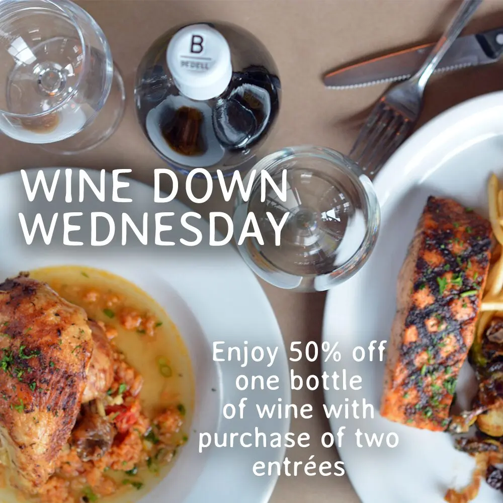 Enjoy 50% off one bottle of wine with purchase of two entrées